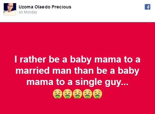 A young lady identified as Uzoma Olaedo Precious, has taken to the social media platform, Facebook, to reveal she will rather have a baby for a married man than a single guy.