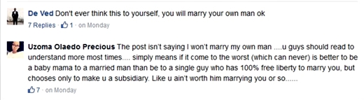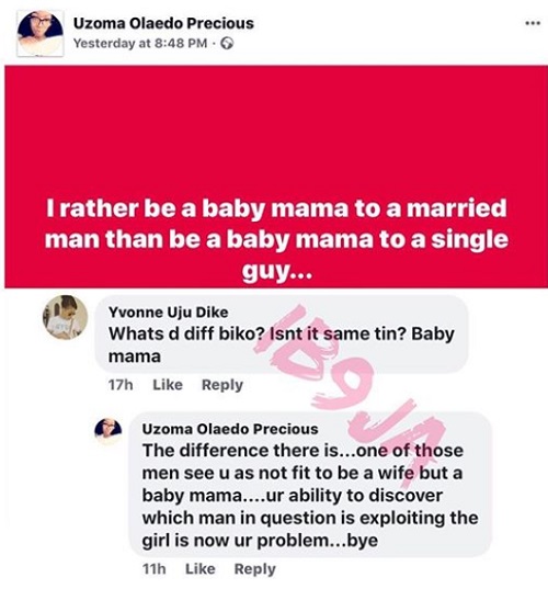 One De Ved told Precious not to think of herself that way, but she replied saying: "The post isn't saying I won't marry my own man ....u guys should read to understand more most times.... simply means if it come to the worst (which can never) is better to be a baby mama to a married man than be to a single guy who has 100% free liberty to marry you, but chooses only to make u a subsidiary. Like u ain't worth him marrying you or so…"