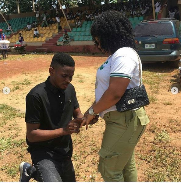 The NYSC member got engaged on the day of her Passing Out Parade (POP) as her boyfriend showed up at the venue and popped the big question. She happilly accepted.