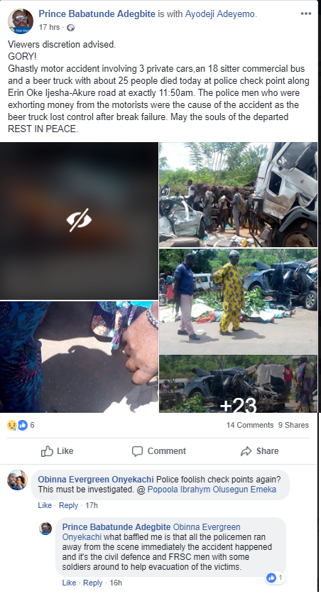 A Facebook user identified as Prince Babatunde Adegbite, has taken to the social networking platform to share some graphic photos from the scene of a multiple vehicle accident which occurred at police checkpoint along Erin Oke Ijesha-Akure road in Osun State, and led to the death of 25 people.